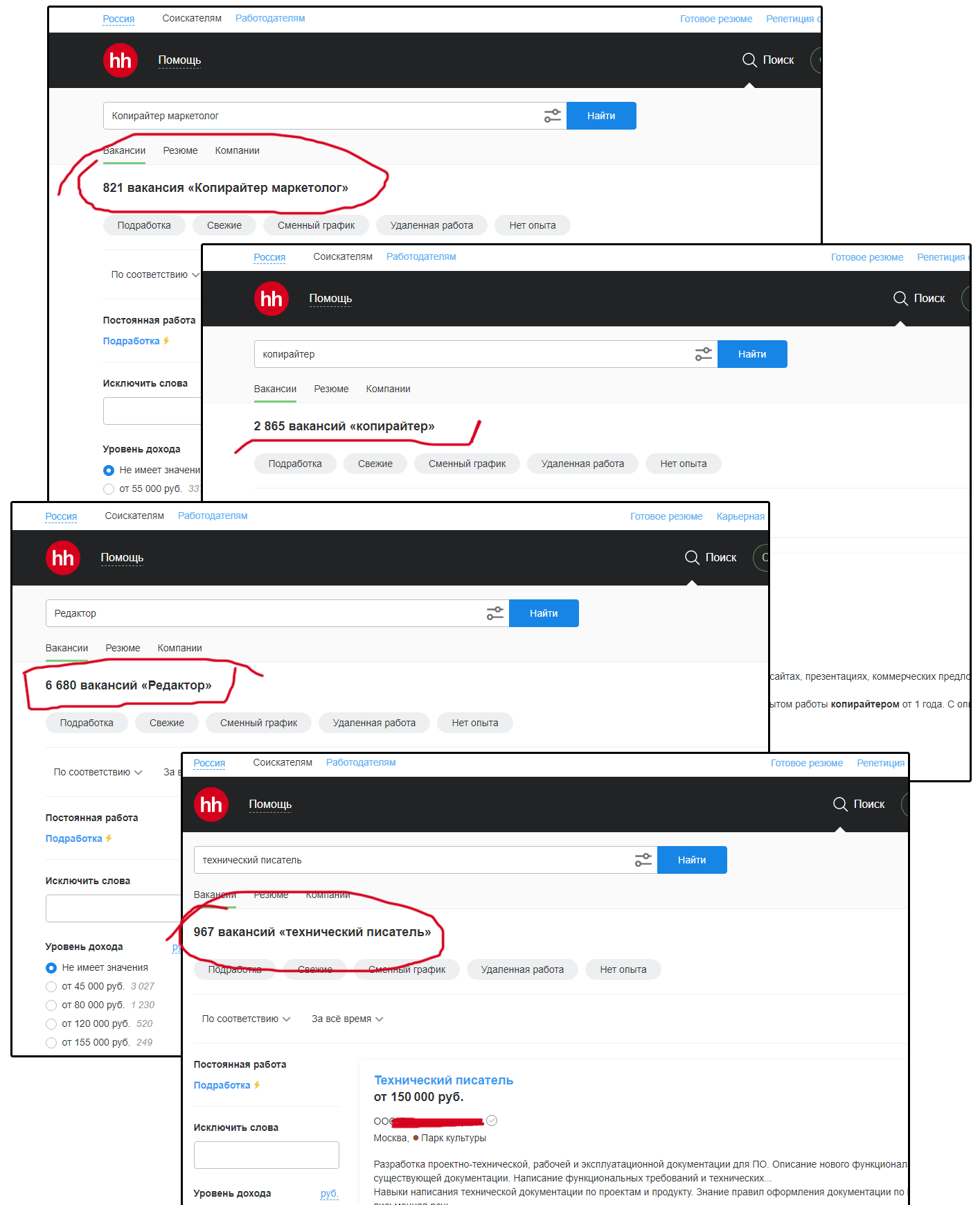 Очень важно помнить, что помимо платформы hh.ru, существует большое количество других онлайн-сервисов и чатов в Telegram, где заказчики ищут копирайтеров. В этих источниках специализаций, требующих навыков работы с текстами, более двадцати.